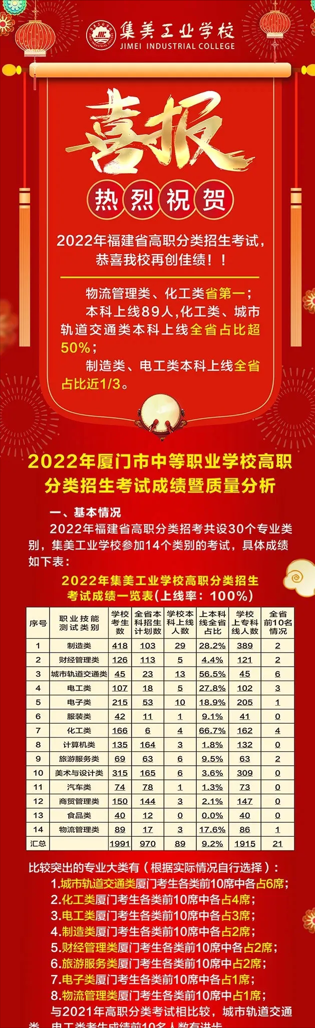 厦门工商旅游学校、集美工业学校高职上线率达到100%。