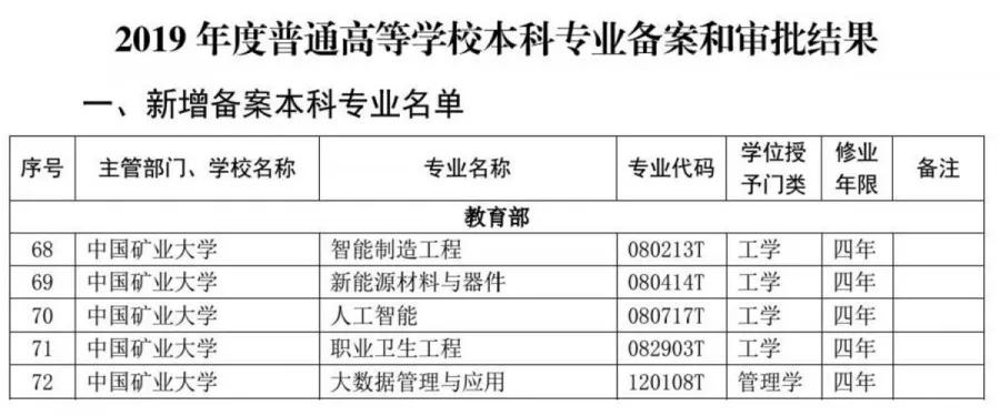 中国矿业大学审批了5个专业,并且全部获得审批并且备案。
