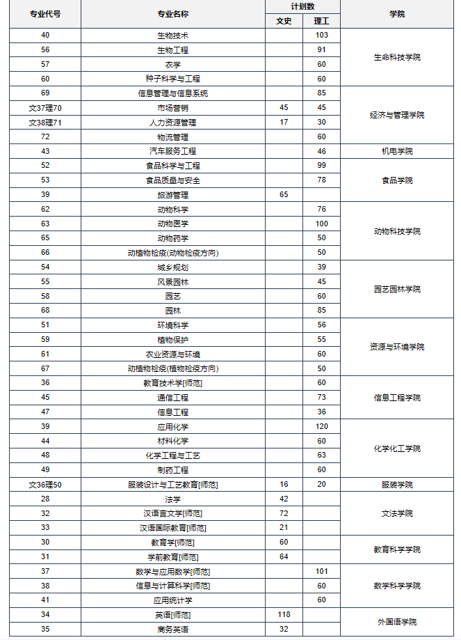 建校80年来,学科专业已涵盖农学、工学、理学、管理学、教育学、文学、经济学、法学、艺术学等9大学科门类,拥有21个教学学院,66个本科专业,合作办有独立学院--新科学院,全日制普通在校生28230人。