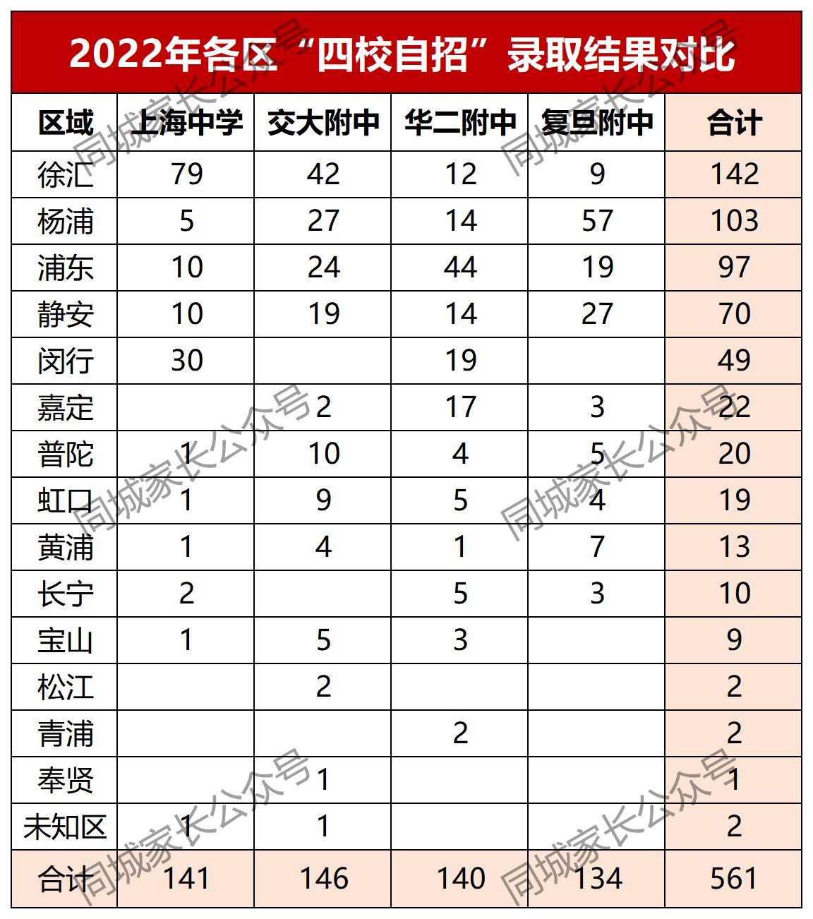 2022年,上中、华二、交附、复附,四校通过自招共预录561人,其中上海中学141人,交大附中146人,华二附中140人,复旦附中134人。