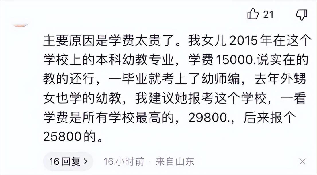 有家长直接嫌弃山东英才学院的学费太贵了,自己的女儿在这所学校上的是本科幼教专业,学费是15,000,自己的外甥女学的也是幼教专业,但报考的时候学费升到了29800元。