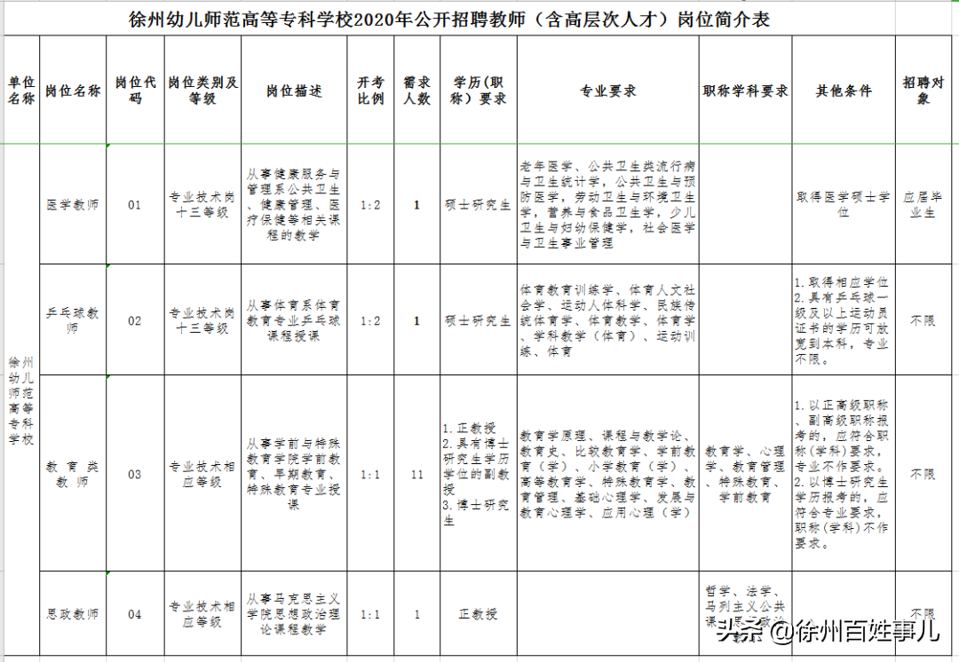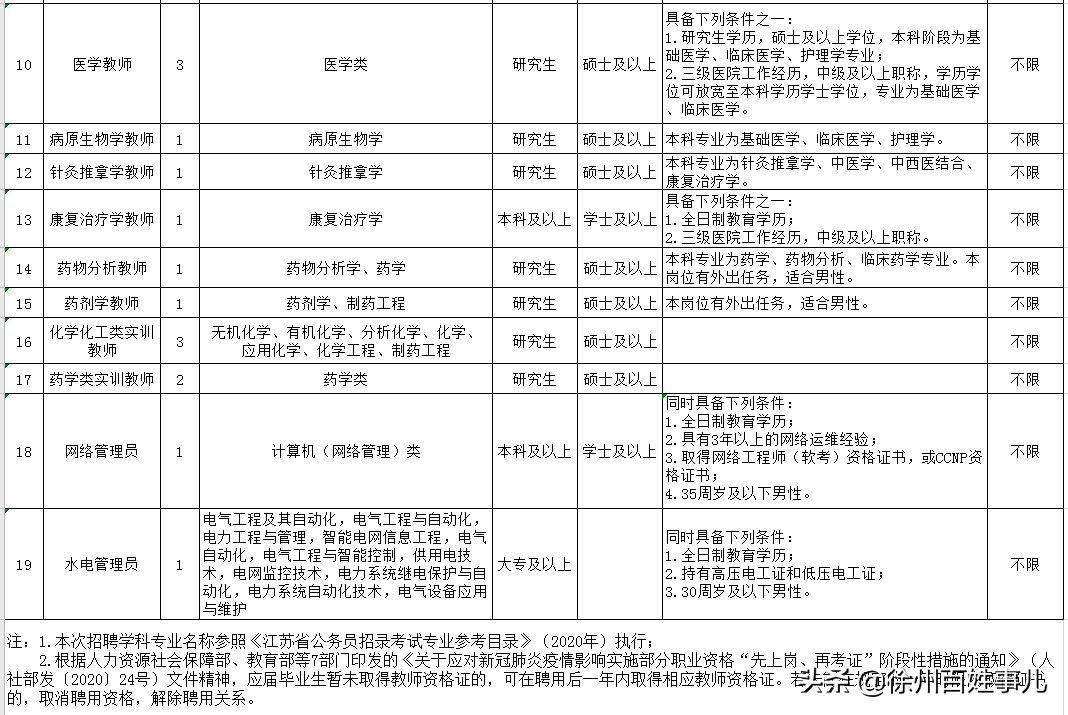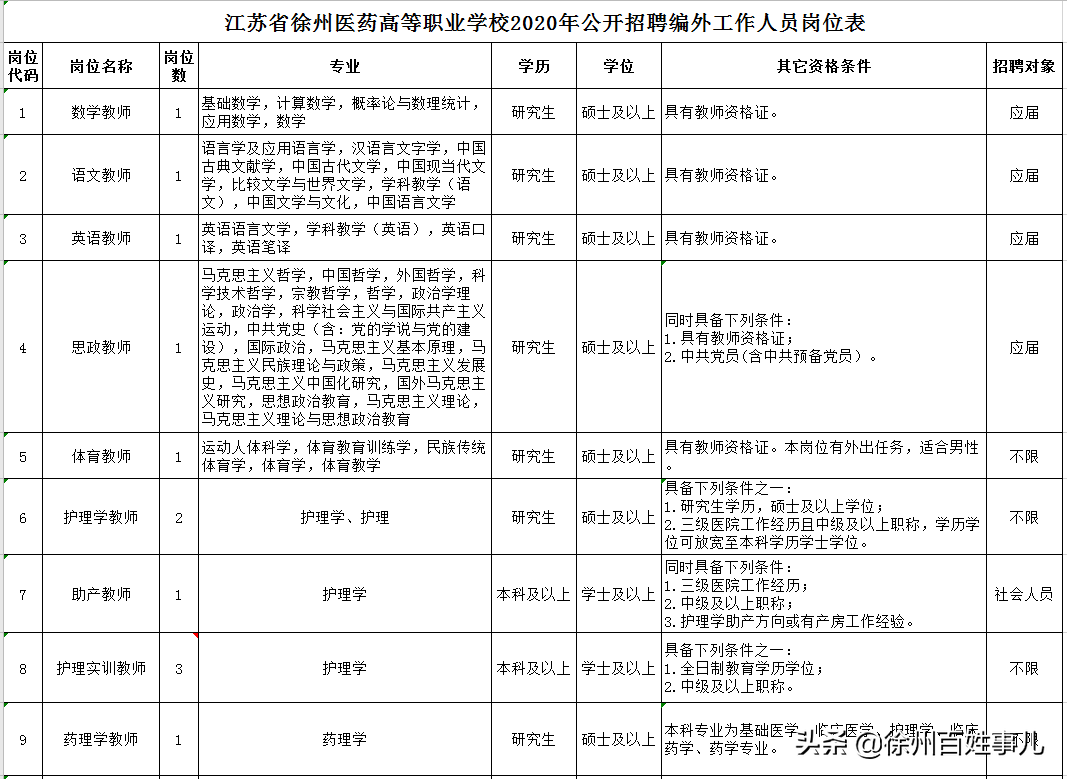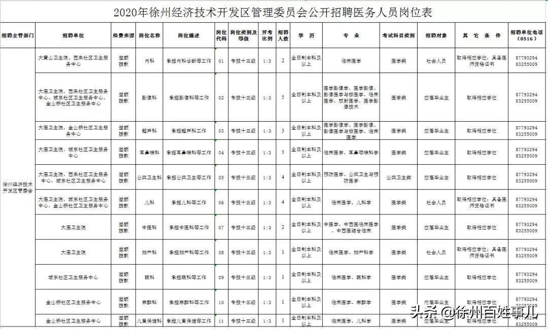 具体招聘单位、岗位名称、招聘人数、招聘对象等详见《2020年徐州经济技术开发区管理委员会公开招聘医务人员岗位表》(以下简称《岗位表》)。