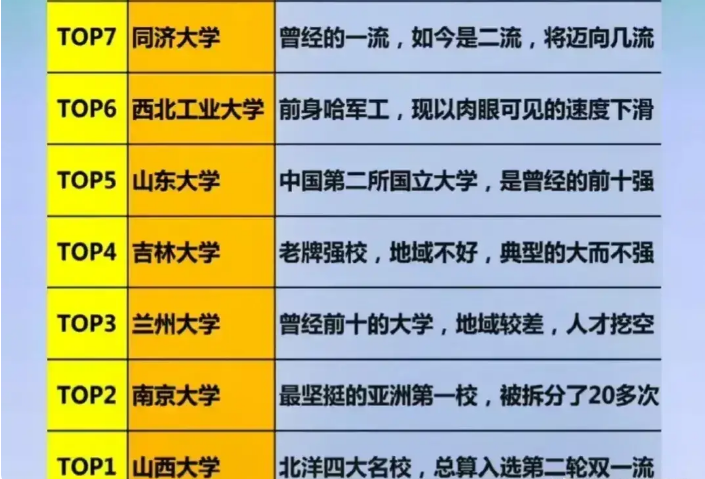 就算上榜的高校,和其在办学历程中最辉煌时期的地位和影响力有所下降,进而出现了实力下降,或者名气不如之前的情况。