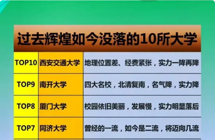 因为如果不一直进步那就会容易出现没落,进而不见过去的辉煌,名单中的几所高校就是这样。