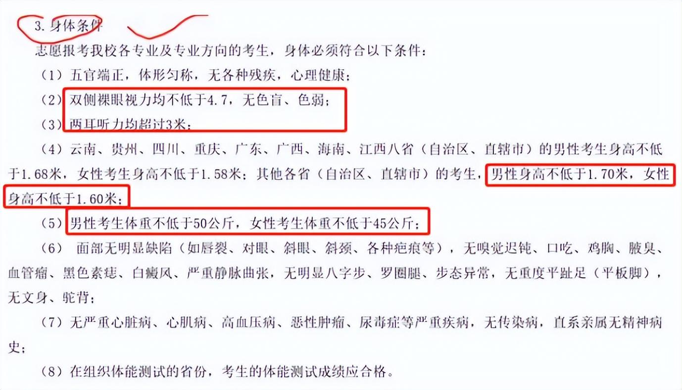 身体条件缺一不可,这类学校对各项要求都是很严格的,对于视力,身高,体重都有明确的要求,差一点都不行,所以想要报考这类院校的考生以及家长,一定要及时了解相关信息。