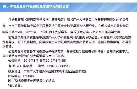 今年年初,广州大学研究生院发公告,表示有72名研究生在规定的最长学习年限内未完成学业,学校因此做出退学处理。