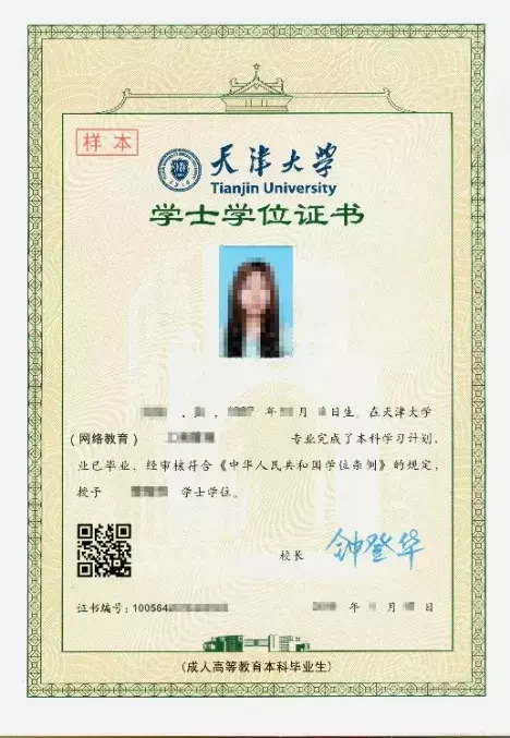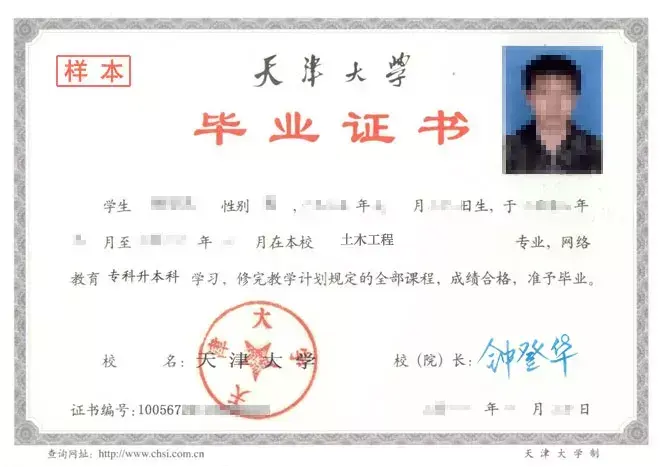 学生在学习期限内修满所修专业教学计划规定的全部学分、考试成绩合格,专科升本科学生须通过教育部规定的现代远程教育试点高校网络教育部分公共基础课全国统一考试,可获得国家承认的由教育部统一电子注册的天津大学毕业证书,注明网络教育,加盖“天津市成人高等教育证书专用章",电子注册中办学类型代码为“7”。符合教育部、天津市及天津大学有关成人学位授予条件者,授予成人高等教育学士学位。