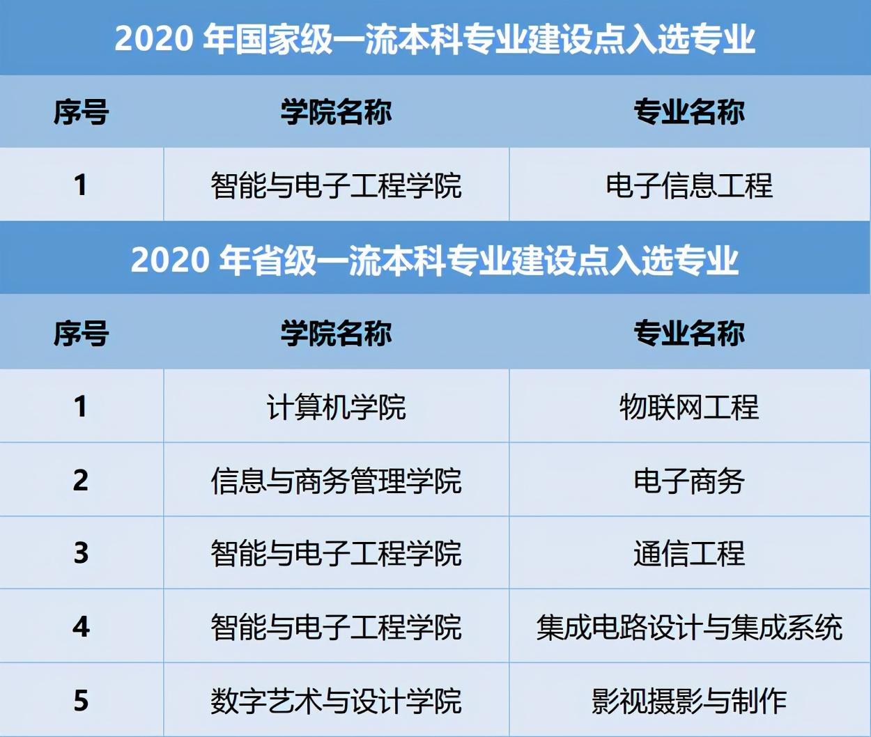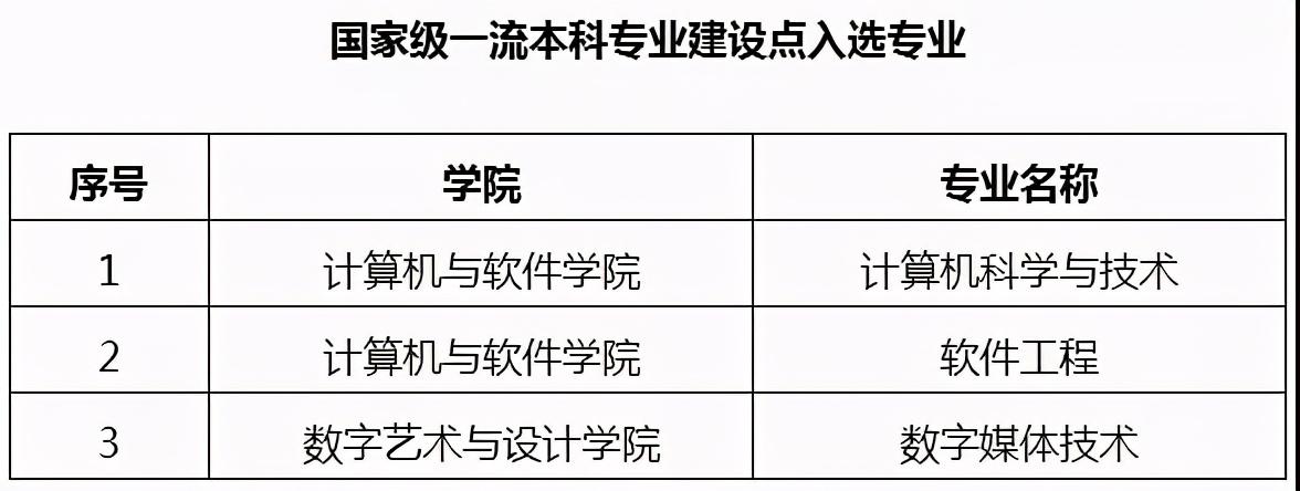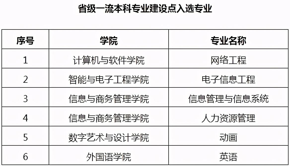 在全国第三方大学评价咨询机构艾瑞深校友会网(Cuaa.Net)最新发布的2020中国一流专业排名、2020中国民办大学一流专业排名和2020中国最好专业排名等榜单中,学校计算机科学与技术、软件工程、数字媒体技术3个专业荣膺中国六星级专业,跻身2020中国顶尖专业行列;网络工程、物联网工程、物流工程、影视摄影与制作4个专业荣膺中国五星级专业,跻身2020中国一流专业行列。
