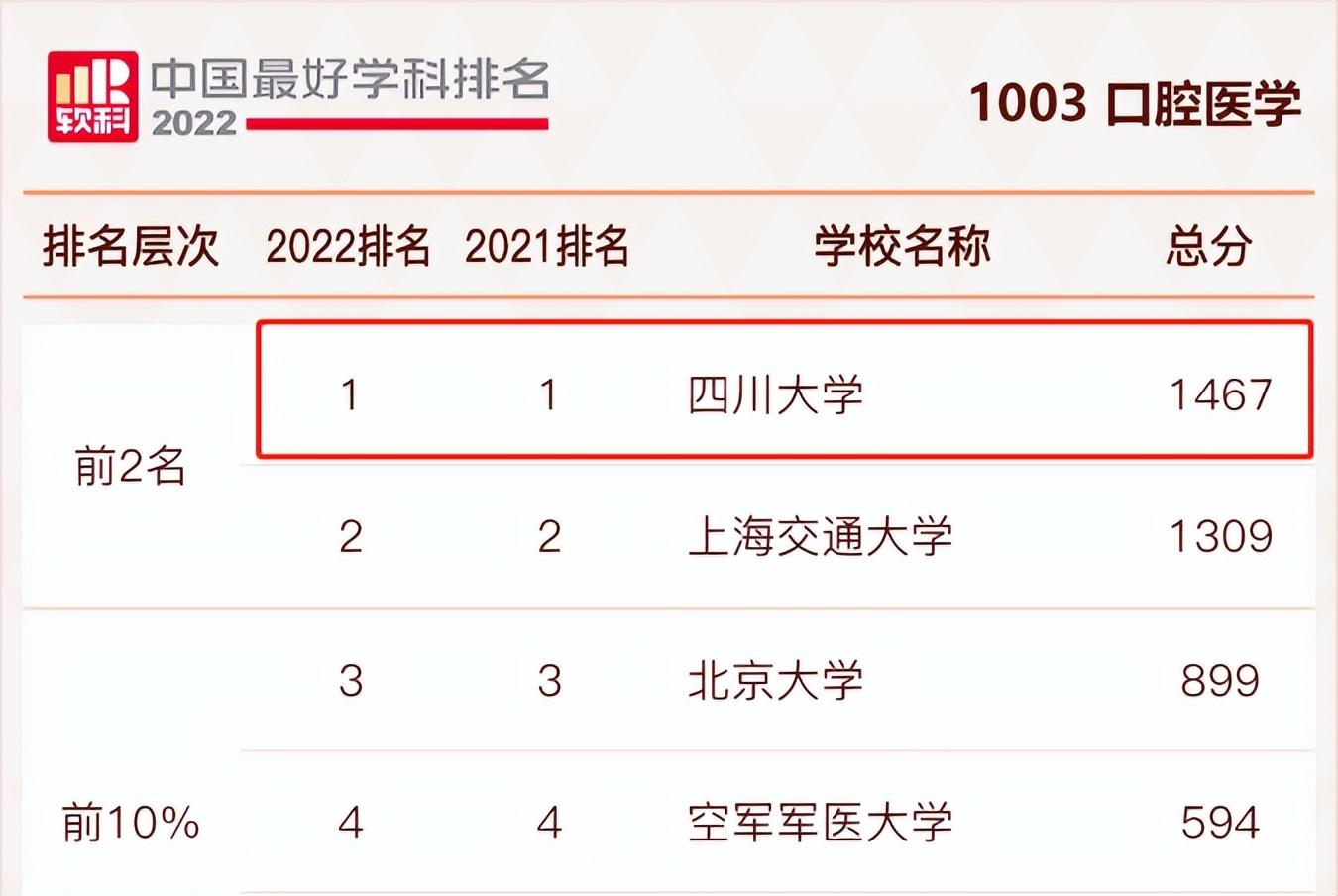 四川大学口腔医学为一级学科国家重点学科,在教育部全国高校一级学科评估中,连续四次(20年)荣列口腔医学第一名,入选教育部“双一流建设”一流学科建设名单,在全国首次口腔医学专业学位水平评估荣列“A+”,已连续五年荣获软科中国最好学科口腔医学第一名。获批建设国家口腔医学中心。