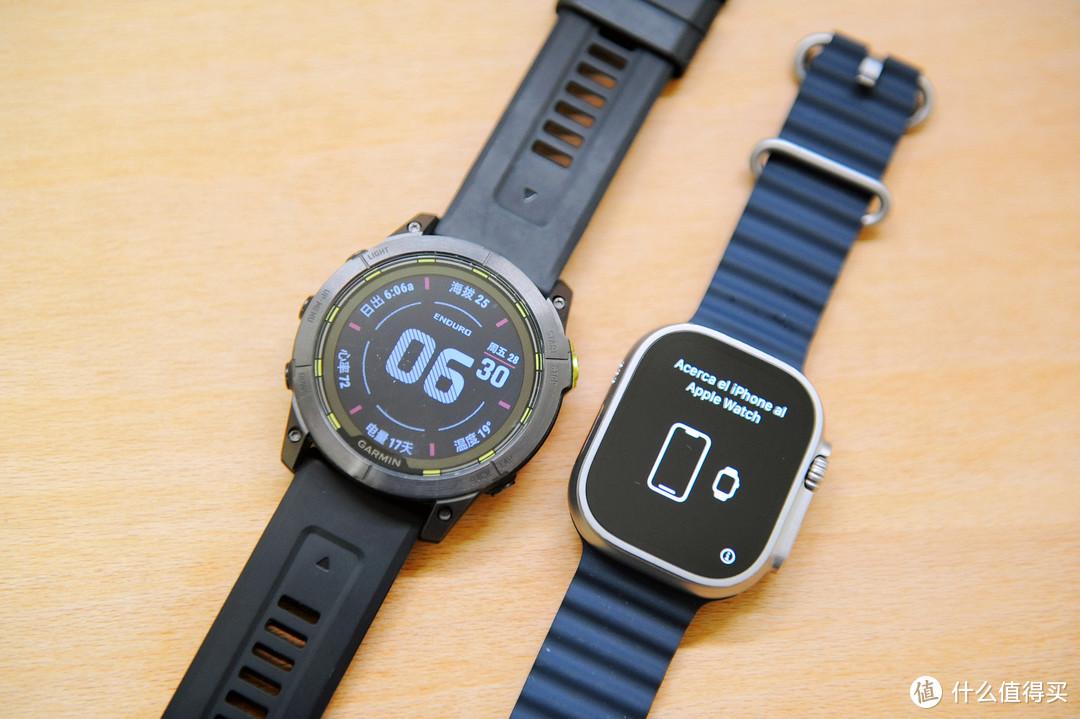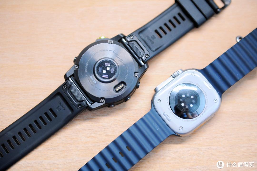 佳明ENDURO2的手表设计有第四代光学心率传感器和充电(数据)接口,更具实用性;苹果采用的是磁吸式的充电方式,更具科技感。