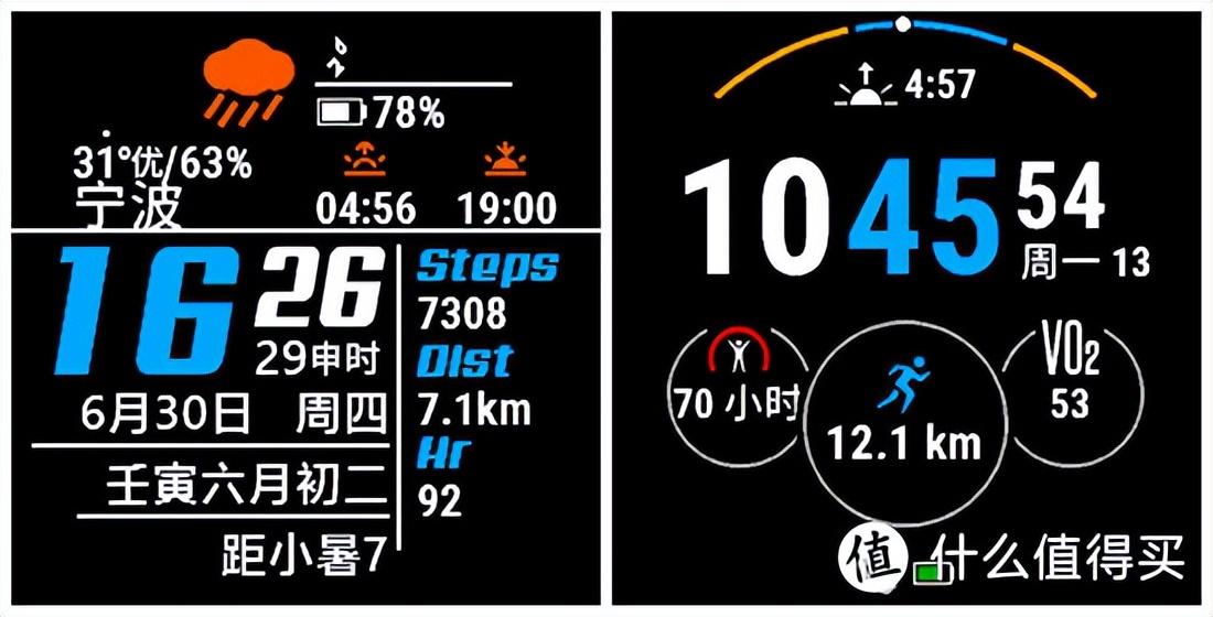第三方表盘,拥有更多的数据段可以显示时间、农历、定位、天气、空气质量指数、日落日出、电池、蓝牙情况、信息数量、步数、运动距离、节气、心率等等。