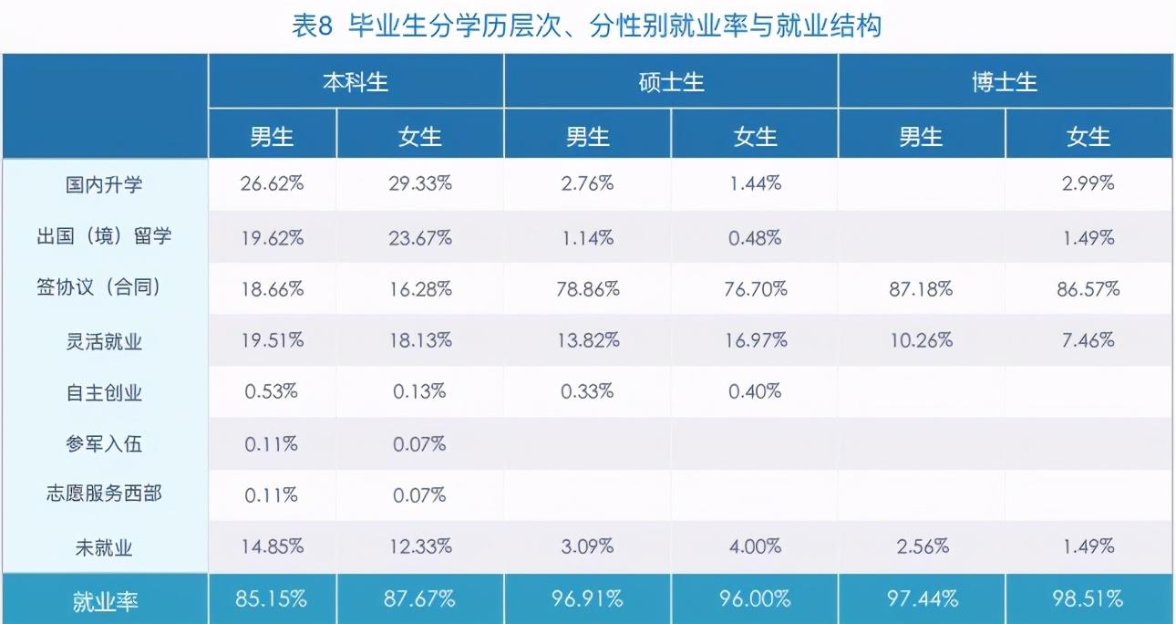本科生的就业率是86%,硕士就业率约96.5%,博士就业率约98%。本科生的月薪是7887元,硕士超1万,博士月薪为9674元。