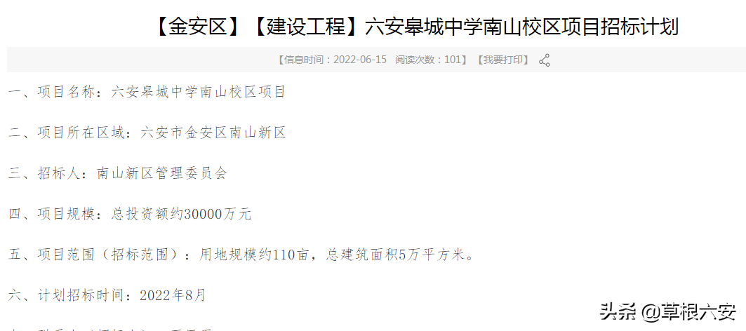 刚刚!六安市公共资源交易中心发布:六安皋城中学南山校区正式发布招标计划!