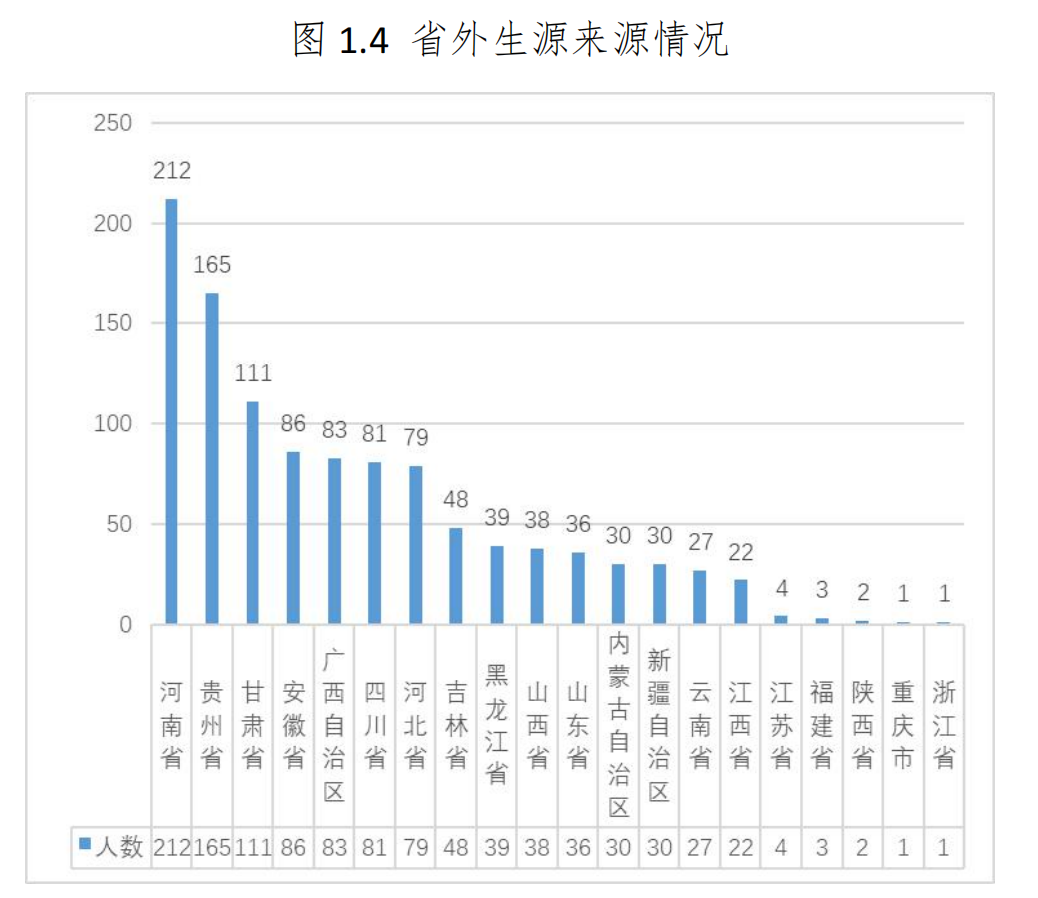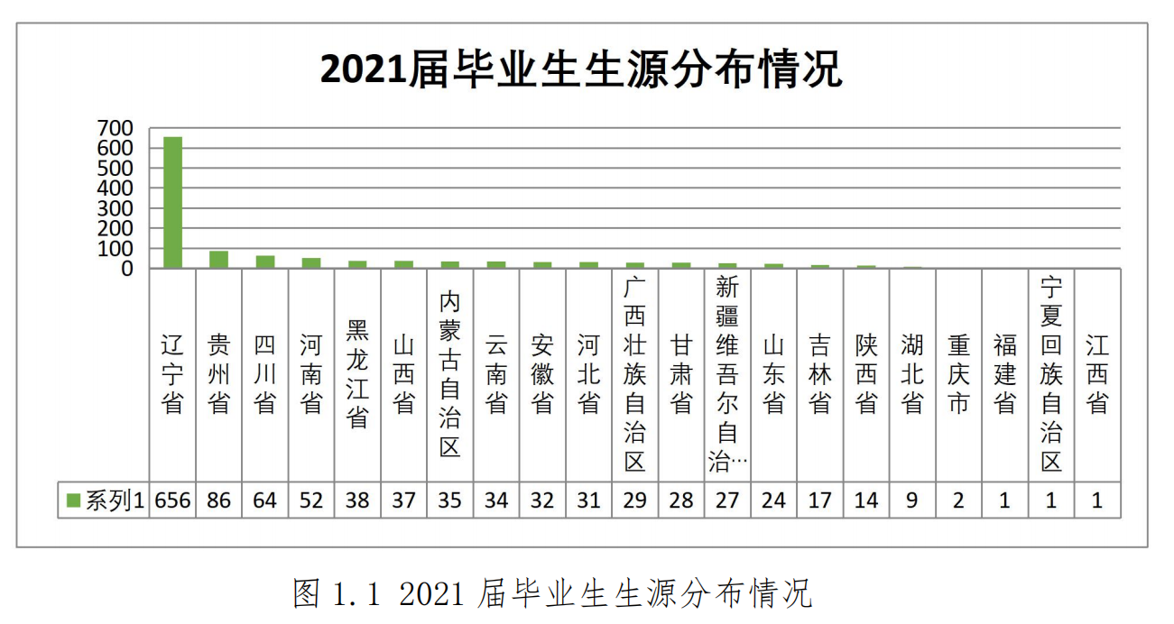 辽东学院 2021 届毕业生共有 4012 人,其中,本科生 2339 人,占毕业生总数 58.30%;专科生 1673 人,占毕业生总数 41.70%。各学历层次 的女生均多于男生,其中,本科毕业生男女比为 1:2.16,专科毕 业生男女比为 1:3.14。毕业生来源于 21 个省(直辖市、自治区),分布较 广,其中,省内生源共有 2914 人,占毕业生总数的 72.63%;省 外生源共有 1098 人,占毕业生总数的 27.37%,与 2020 年相比, 省外毕业生数有比较明显的增加。