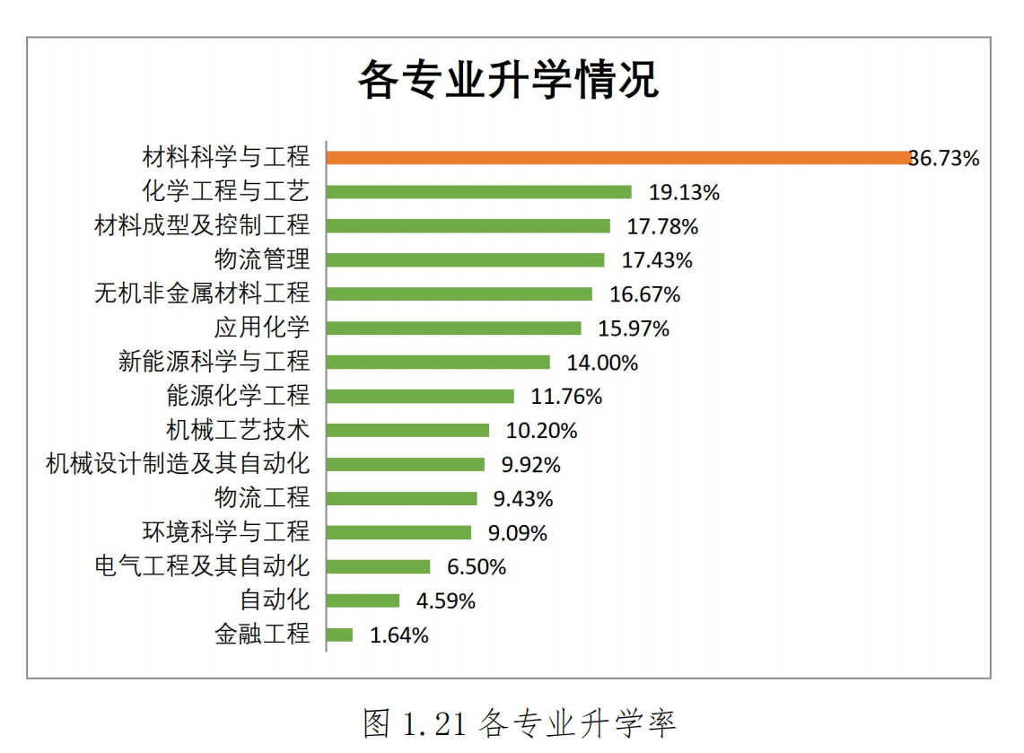 营口理工学院的分专业就业升学情况的话,新能源科学与工程专业就业率最高,材料科学与工程专业升学率最高 36.73%, 金融工程专业升学率最低 1.64%。具体到每个专业的情况,建议大家参考下面这三张图片,看看每个专业有多少毕业生,再去看就业率和升学率。