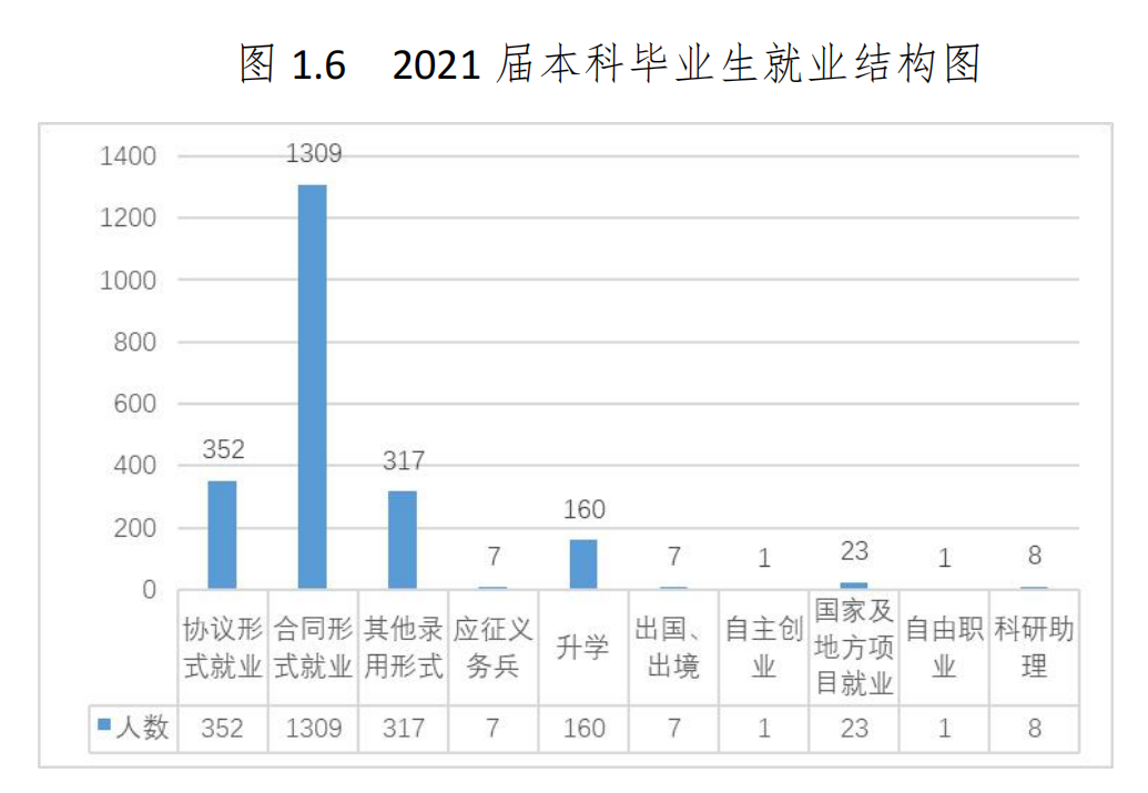 营口理工学院给出的数据则是,2021 届毕业生 1218 人,初次就业率为 89.98%,年终 就业率为 95.07%。就业形式主要为协议、合同就业,占比 65.27%,升学占比 12.23%。