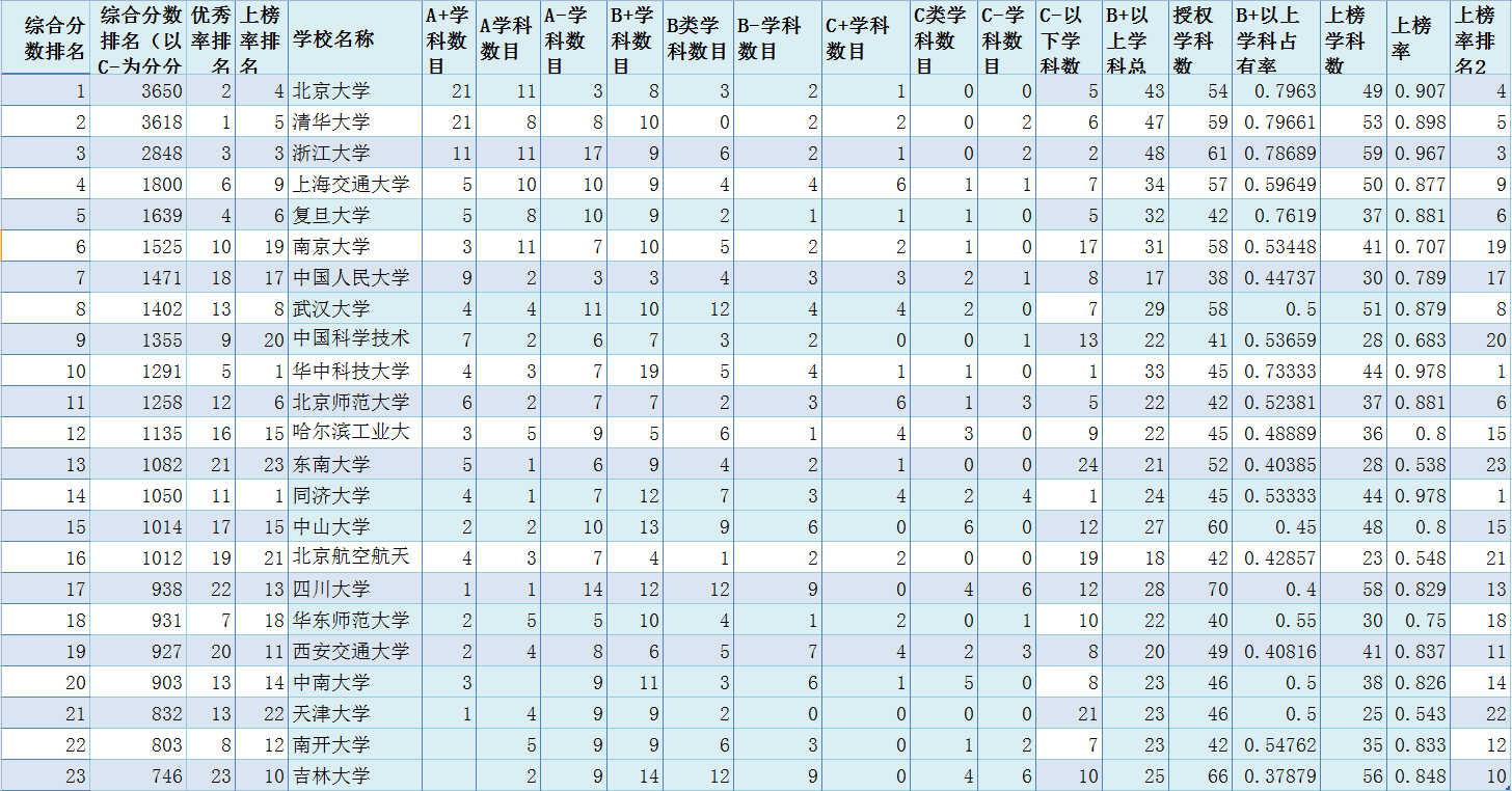 积分计算方式为:以C-为分分界点,每高一级分数是前一级的两倍,如果在C-以下的学科则扣减5分,下图是列出的10个及以上A类学科按照此方法得到的排名。