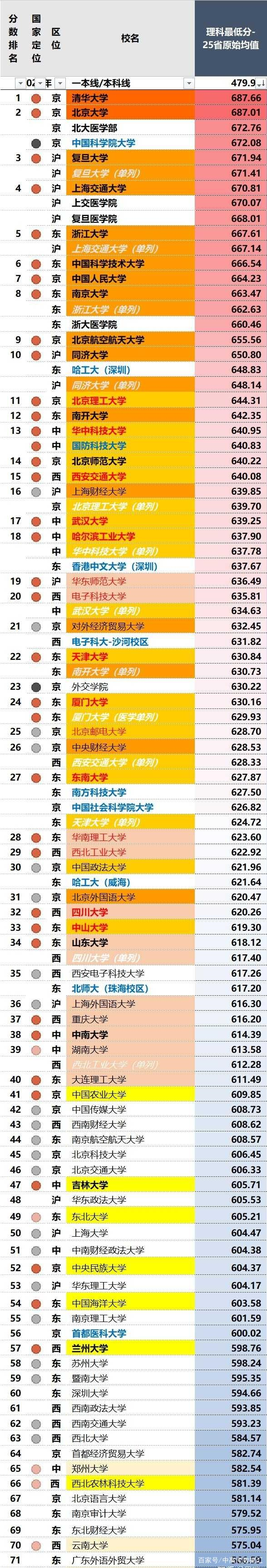 从25个省市的最低录取分的均值来看,前10高校分别为:清华大学、北京大学、复旦大学、上海交通大学、浙江大学、中国科学技术大学、中国人民大学、南京大学、北京航空航天大学以及同济大学。