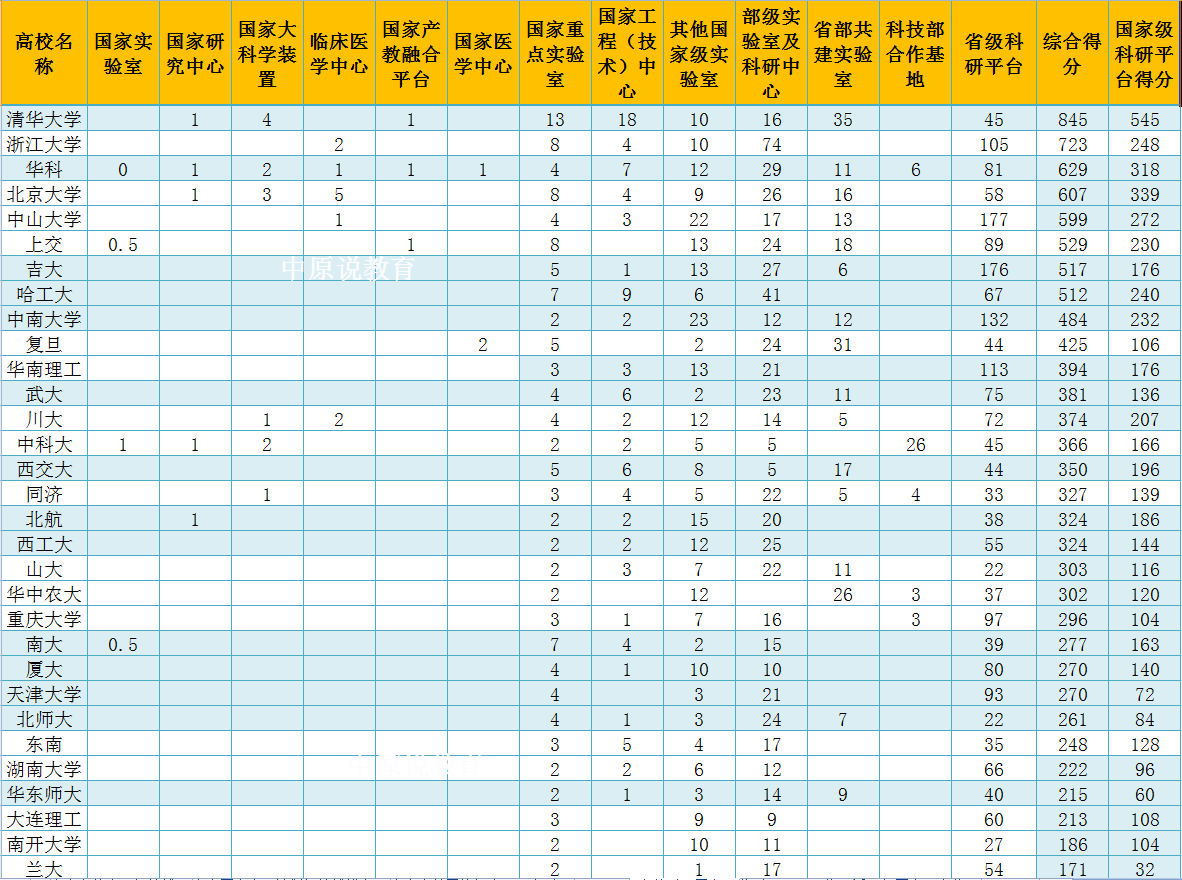 积分方式:国家实验室得分最高,一个得分30分;其次是国家研究中心:赋分18;国家大科学装置、国家医学中心以及产教融合平台赋分15;国家重点实验室、国家临床医学中心以及国家工程技术中心赋分12;其他国家级平台赋分8,部级和省部级科研平台得分5;省级科研平台得分1。最终将高校各级别的得分相加,得到其综合得分。