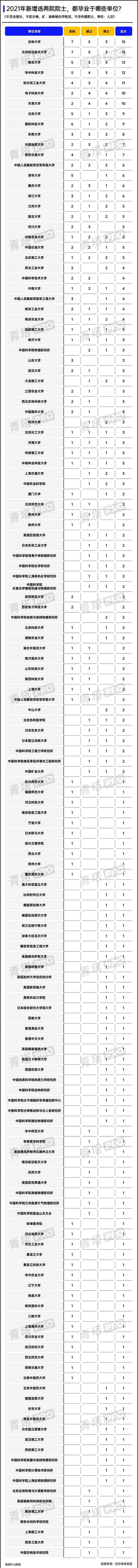 再次,我们再来看2021年新增两院院士中,各大高校拥有的人次数据。位列前10的高校分别为:吉林大学、北京航空航天大学、南京大学、华中科技大学、哈尔滨工业大学、电子科技大学、天津大学、北京大学、国防科技大学以及东南大学。整体来看,院士还是多产自于985高校。