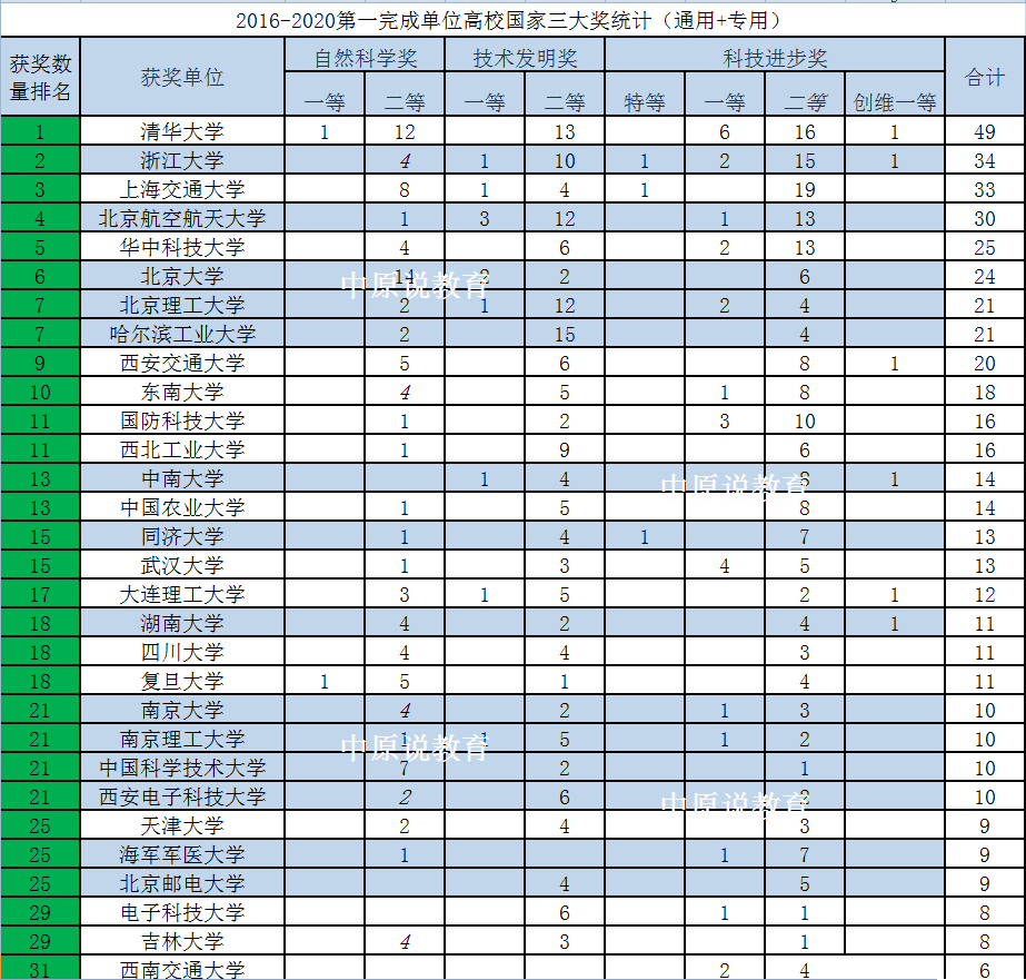 在国家三大奖方面,以获奖数量为准,前10的高校分别为:清华大学、浙江大学、上海交通大学、北京航空航天大学、华中科技大学、北京大学、北京理工大学、哈尔滨工业大学、西安交通大学以及东南大学。