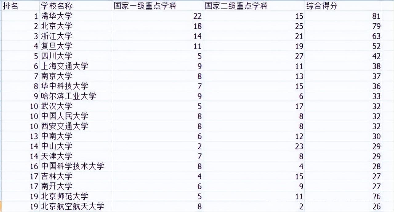 国家重点学科方面,其综合评分按照国家一级重点学科一个占3分,国家二级重点学科一个占1分,如此计算出来最终得分。