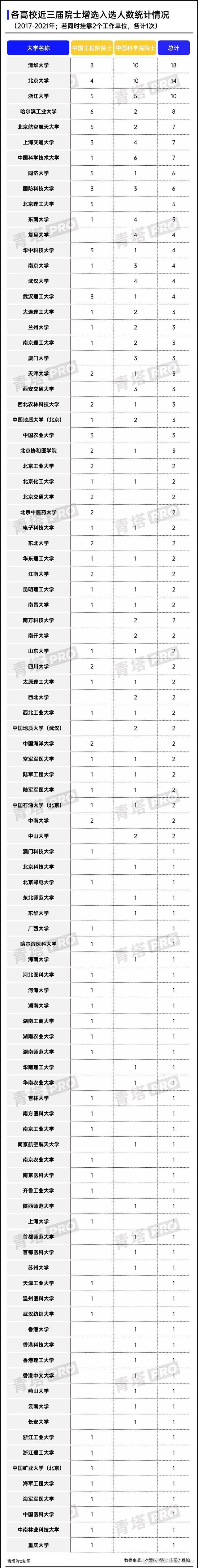 在近3年新增院士的数量比拼中,清华大学和北京大学依然领衔,浙江大学位列第三、哈尔滨工业大学位居第四、北京航空航天大学、上海交通大学以及中国科学技术大学并列第五。