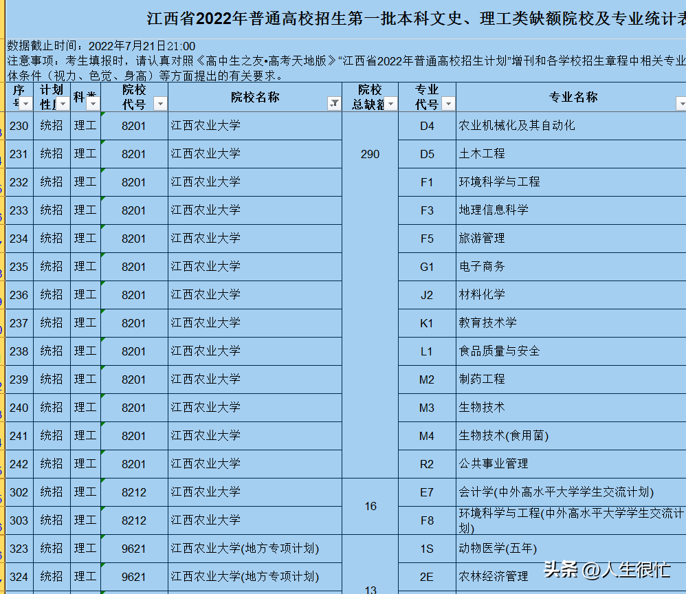 江西农业大学2022年一本招生出现缺额:20多个专业缺额331人。
