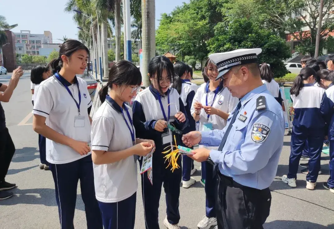 交通民警给学生发交通宣传法规、赠送平安结,告诫学生们要文明出行,遵守交通规则,驾驶电动车要佩戴头盔,未成年人不能驾驶机动车等等。