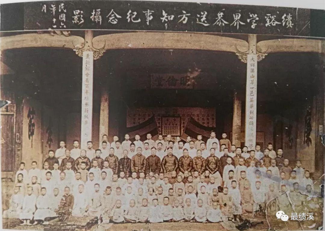 1917年拍摄于绩溪明伦堂的《绩溪学界恭送方知事纪念摄影》照片。众多莘莘学子端坐于师长膝下,循规蹈矩,再现了当年教学的严谨风气。墙壁上“忠孝廉节”四个大字,体现了当时教育宗旨和学风之盛。“化龙亭外风云客、都是明伦堂上人!”,中国水电专家程良骏先生的诗,道出了明伦堂在绩溪教育界的地位。