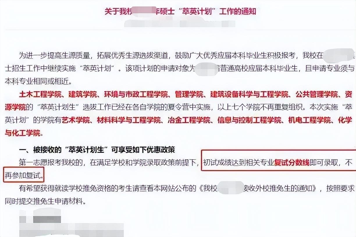 虽然有一定的条件限制,却也值得考生考虑。与之类似的还有西安建筑科技大学,参加学校的萃英计划的学生,在笔试成绩超过专业的录取分数线的情况下,也可以免复试录取。