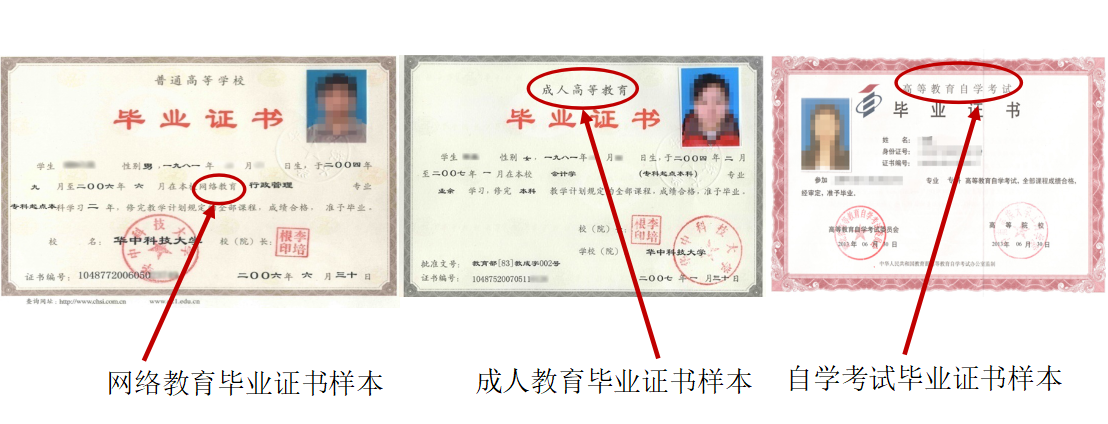 2、成人高考、自学考试、电大、网络教育都颁发国家承认的学历证书,毕业证书获得者的待遇与普通高校同类毕业生相同,都可以参加硕士研究生考试、公务员考试、司法考试等。符合相关条件者,都可以申请获得学士学位;