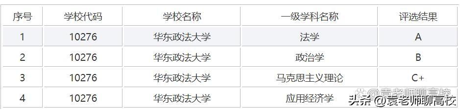 在第四轮学科评估中,华东政法大学有4个学科上榜,其中最强的学科是法学,被评为A,政治学被评为B,具体可见下图。