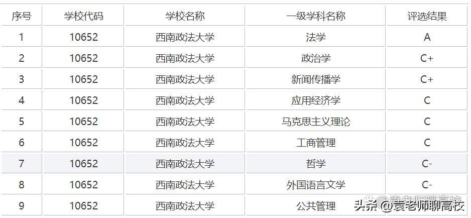 在第四轮学科评估中,西南政法大学有9各学科上榜,其中最强的学科是法学,被评为A,政治学和新闻传播学两个学科被评为C+,具体可见下图。