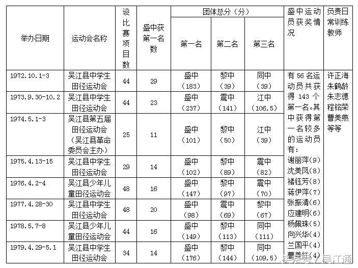 从1972年至1979年,吴江县先后举办了八届中、小学生田径运动会(有时也叫少年儿童田径运动会),其中1974年举办的是吴江县第五届田径运动会,由当时的吴江县革命委员会主办,其余的都是由当时的吴江县革命委员会文教局和体育委员会举办的。盛泽中学取得这八届运动会的团体总分八连冠,盛中和前三名兄弟学校具体成绩如下表: