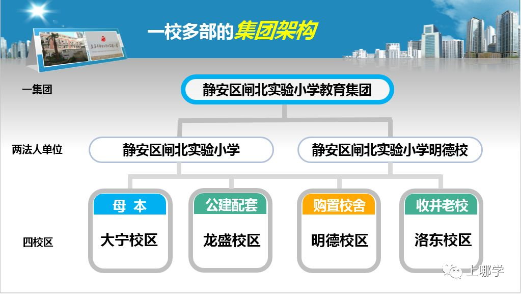 2014年4月,为了落实“学区化 集团化”办学的教育综合改革,静安区闸北实验小学教育集团正式成立。用“一校多部 多部均衡”的集团创建理念扩大优质教育资源总量。