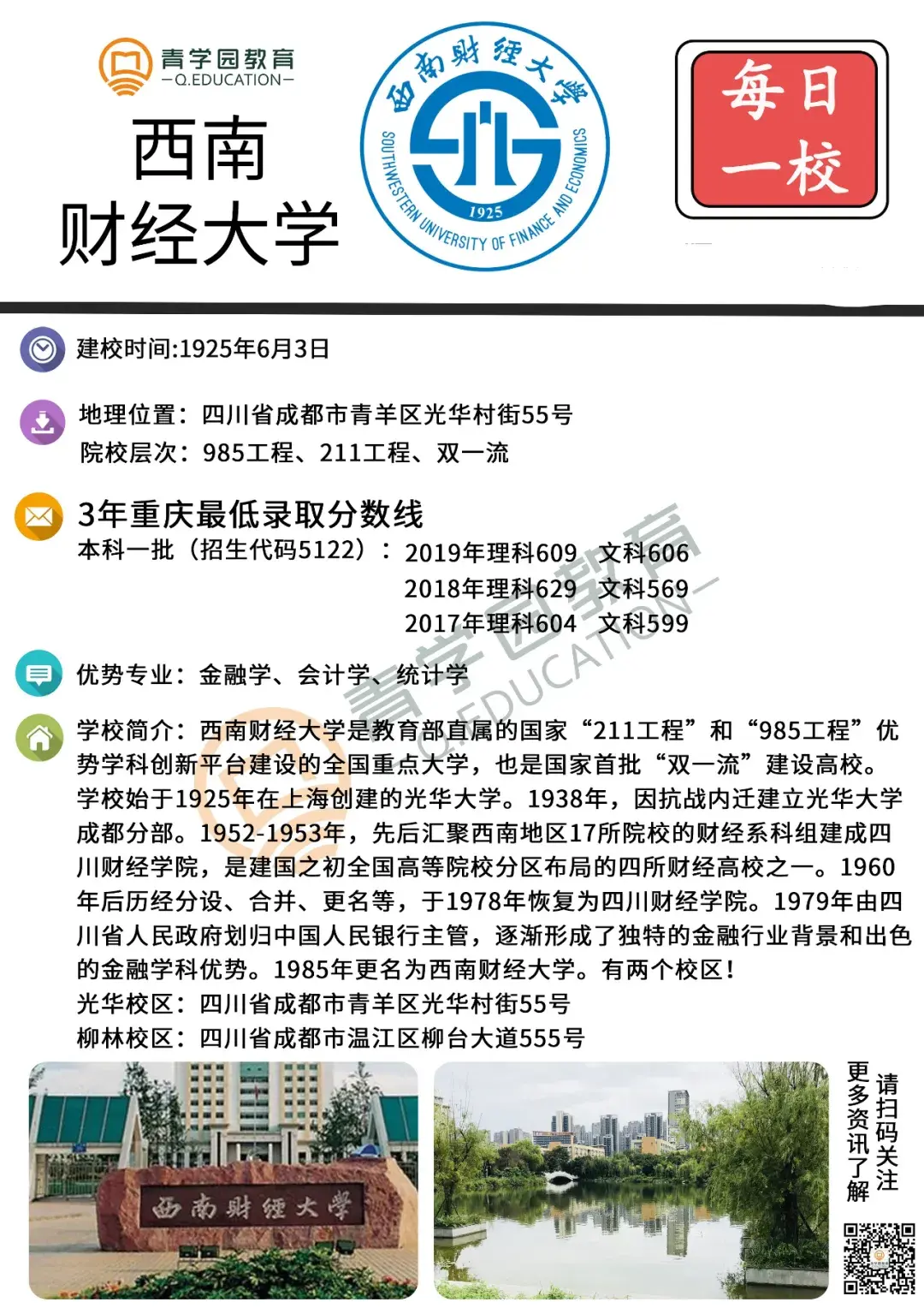 西南财经大学是教育部直属的国家“211工程”和“985工程”优势学科创新平台建设的全国重点大学,也是国家首批“双一流”建设高校。学校始于1925年在上海创建的光华大学。1938年,因抗战内迁建立光华大学成都分部。