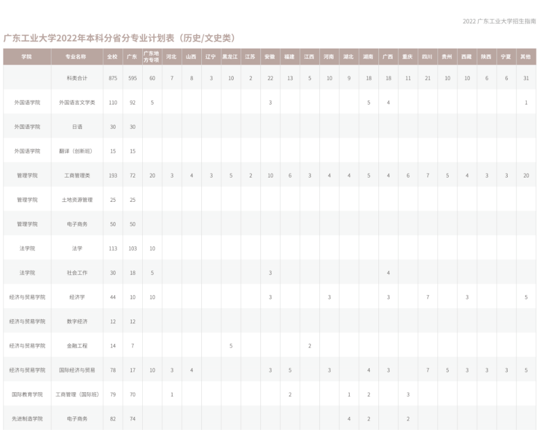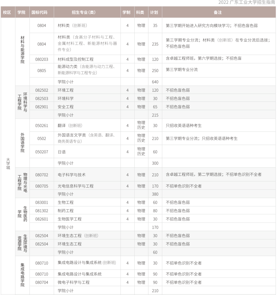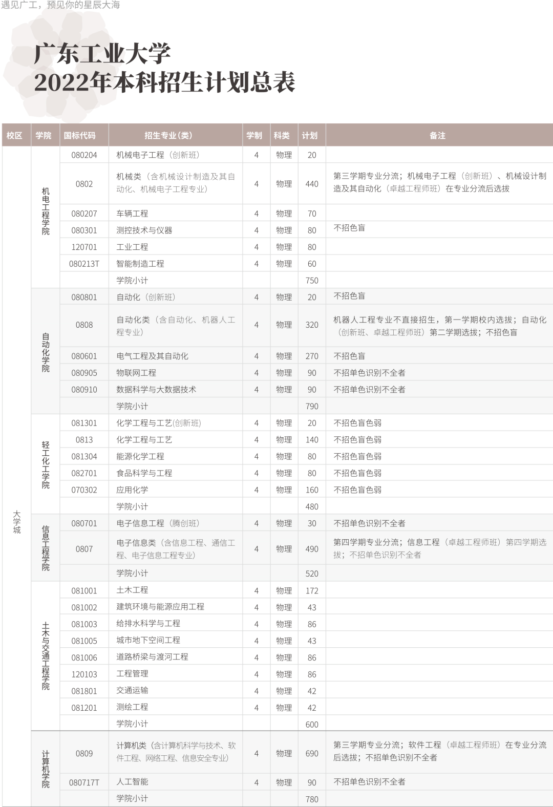 广东工业大学2022年本科招生总计划10200名。其中,广东省计划8742名(广东省地方专项270名),省外计划1184名,不分省计划274名。