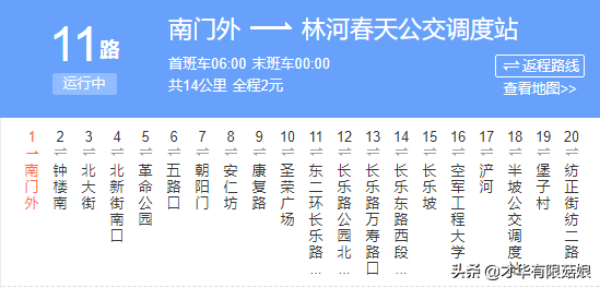 11路公交线路自1953年2月开通至今,已经有60多年历史。最早的时候,11路叫“东郊线”,由东五路至灞桥,那时它是纯粹的东郊公交。直到2007年它的终点才延伸至南门;2014年它的起点从五厂变成了林河春天。相信每一个东郊人内心都对11路有着割舍不掉的感情。
