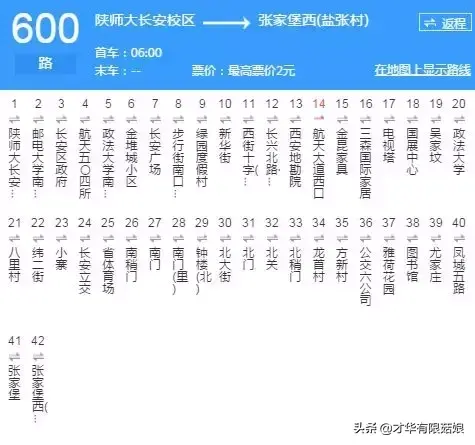 600路公交线路,总计42站,从政法大学到张家堡西,从城南到城北,从长安到未央。