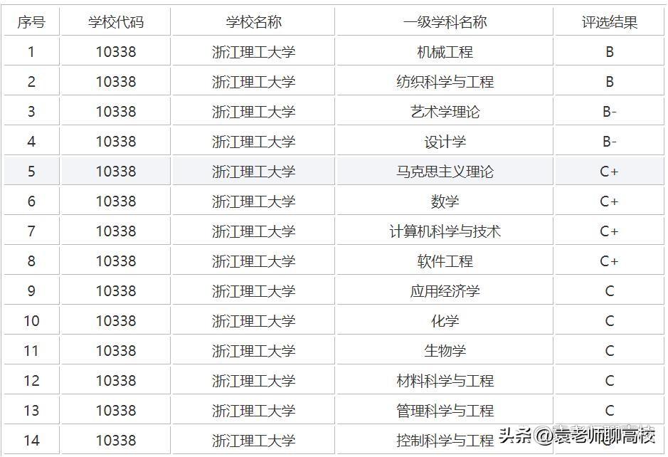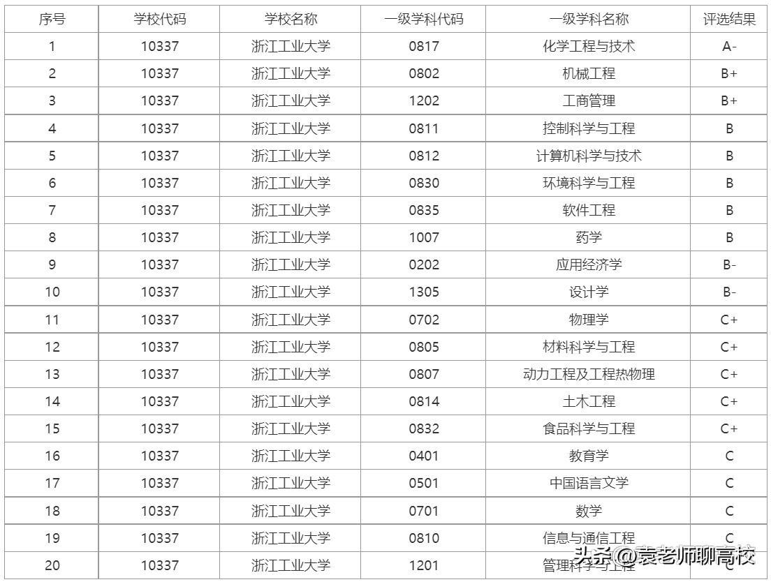 在第四轮学科评估中,浙江工业大学有20个学科上榜,其中化学工程与技术被评为A-,机械工程和工商管理等两个学科被评为B+,具体可见下图。