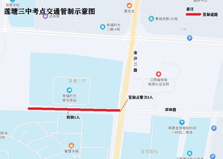 (2)莲塘一中西门临街道路、洪州学校西侧临街道路交通管制地段:南起农科路与莲西大道交界的红绿灯路口处,北至小蓝北路以南的原小蓝路与莲西大道交界路口处。