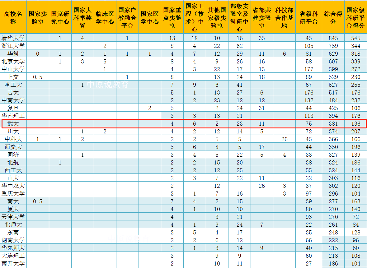 科研平台:武汉大学共有4个国家重点实验室、2个国家工程技术研究中心、2个国家野外科学观测研究站、2个2011协同创新中心、1个国家高端智库、2个国家科技基础条件共享平台、9个教育部重点实验室和5个教育部工程研究中心;还拥有7个教育部人文社会科学重点研究基地、10个国家基础科学研究与人才培养基地、10个国家级实验教学示范中心、3个国家级虚拟仿真实验教学中心和1个国家大学生文化素质教育基地。定期公开出版36种专业刊物。