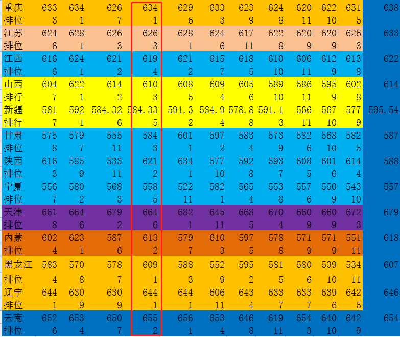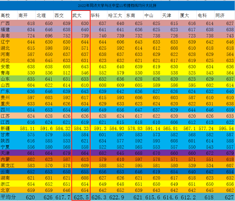 除此之外,武大在海南、河南、广东、陕西以及内蒙古的投档分也有不俗的表现,在中坚九校+南开+电子科大以及同济大学这12所高校位居前列,同时相较于往年也有明显的进步。