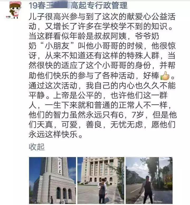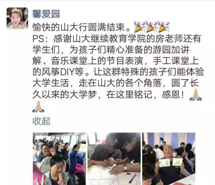 “我和你一样,一样的坚强,一样的全力以赴追逐我的梦想”一句歌词道出本次活动主人公的心声。他们是社会上的特殊人群,智力的障碍使他们只能像小孩子一样生活,但这不阻碍他们怀揣美好的梦想——去正常的学校学习。因此,暮春浅夏,在这充满希望的季节,山东大学继续教育学院直属学习中心(青岛校区)2019春网络远程教育高起专2班和3班的网教师生共同策划举办了 “汇聚爱心,共筑大学梦”公益活动,通过帮助馨爱源“孩子们”圆梦的方式,增强山东大学网络教育学生的社会责任感,传递爱心与正能量,带领大家扬帆启程,与馨爱源朋友们共圆大学梦!
