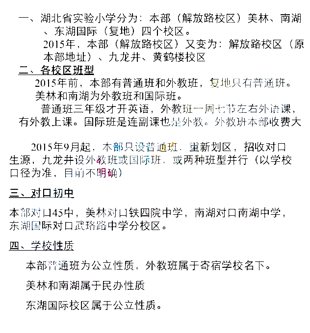 学校简介:武昌实验小学(解放路本部)创建于1920年,位于解放路259号,公办学校。2015年,本部有普通班和外教班,2015年9月起,本部只设普通班,外教班搬入武昌实验寄宿小学(九龙井校区)。