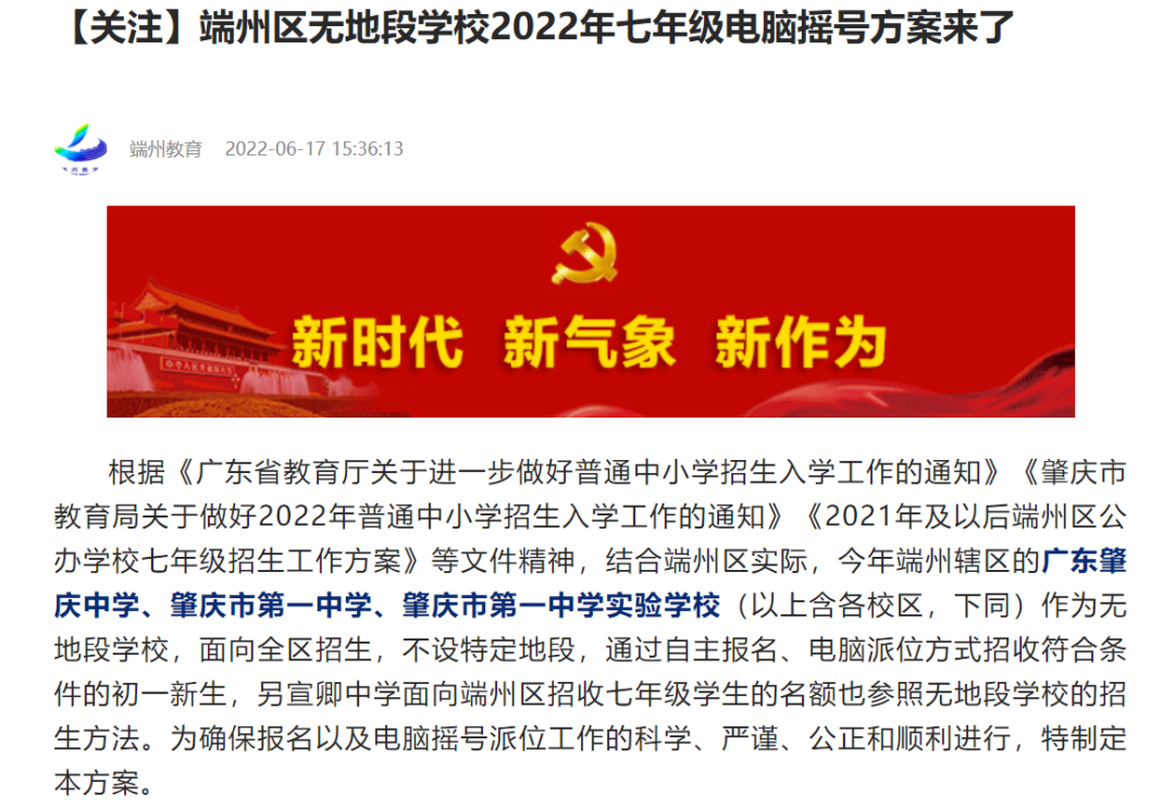下午(6月17日),端州教育发布《端州区无地段学校2022年七年级电脑摇号方案》。