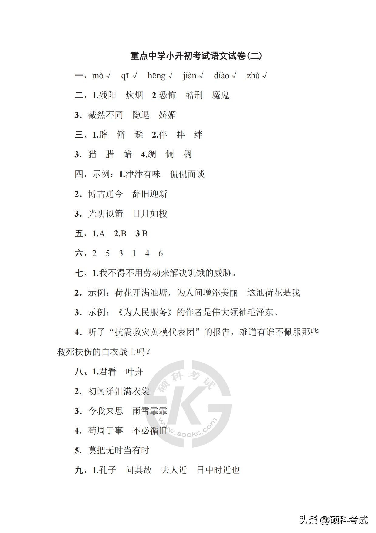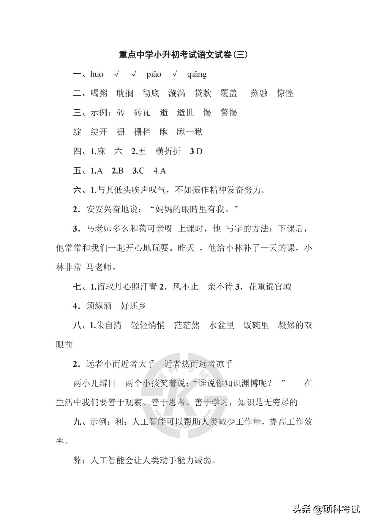 小升初语文重点中学试卷三套由一线优秀教师精心挑选,试题严谨科学,内容丰富,复习方向更明确。回归教材,梳理知识,能进一步夯实基础,形成知识网络,便于及时弥补薄弱知识点。