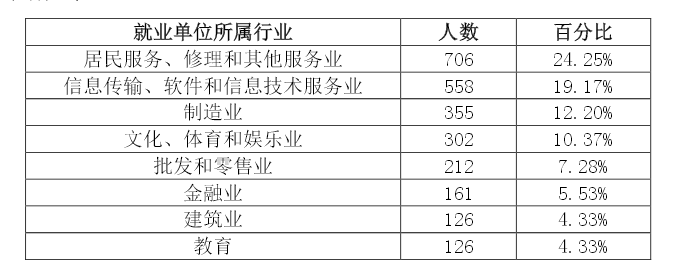 从总体就业行业来看,除国际组织外,参加工作的学生在各行各业均有分布。人数较多的有居民服务业、信息产业、制造业等。人数较少的有卫生和社会工作、水利环境、及科学研究等。