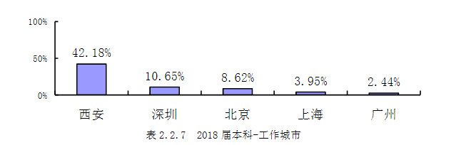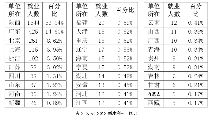 西安外国语大学2018 届本科毕业生参加工作的学生中,超过一半在陕西就业。广东、北京、上海、浙江分列第2-5位。去向人数较多的城市有:西安1228人、深圳310人、北京251人、上海115人、广州71人,合计1975人,占参加工作学生总数的67.85%。